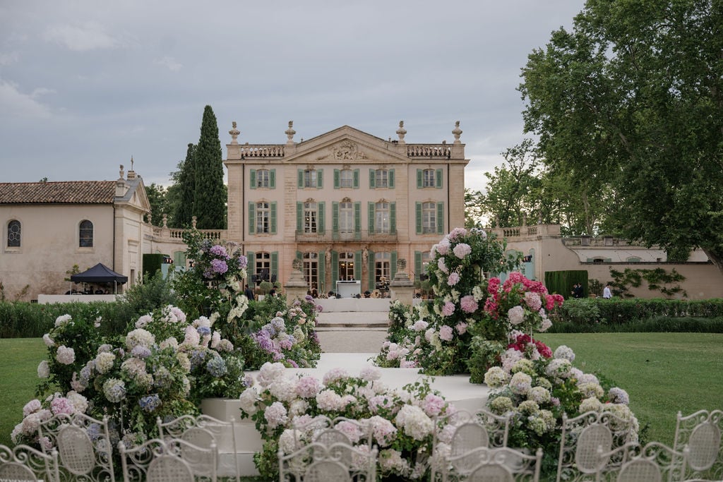 Stefanie and Roche were married in the gardens of Chateau de Tourreau, surrounded by loved ones and hydrangeas